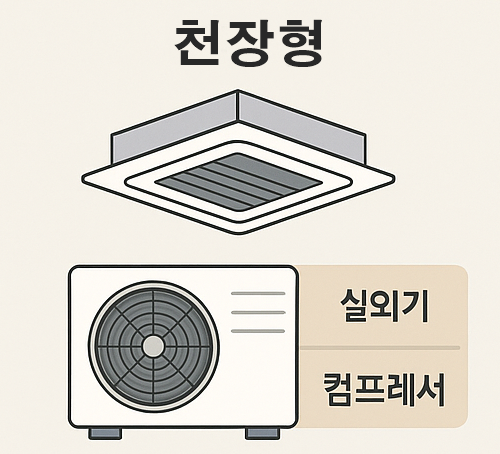 - 장점은 외부 공간 절약, 여러 방을 동시에 냉방할 수 있다.