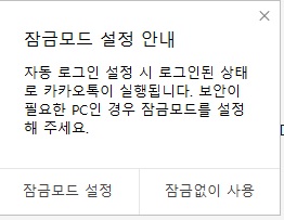 자동 로그인 설정 시는 로그인된 상태로 카카오톡이 실행이 되므로, 보안이 필요한 PC인 경우는 잠금모드로 설정이 필요합니다.
